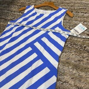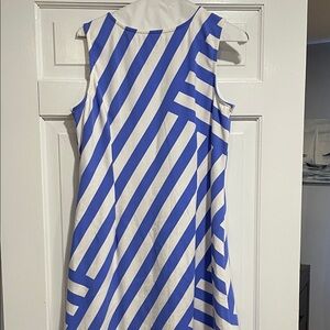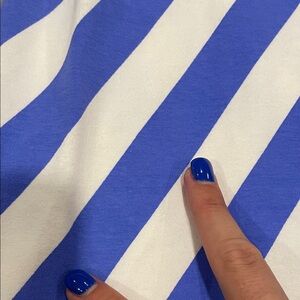 This dress has been worn maybe once, washed delicate cold and laid flat to dry. The fit on me is like a fit and flare—snug in the chest and waist, a bit flared in the skirt - with the asymmetrical stripes, it’s so flattering on!