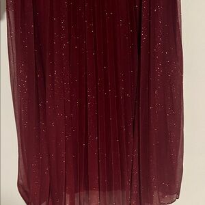 Chic burgundy dress with shimmering details. Long sleeves and pleated skirt. Ideal for elegant events.