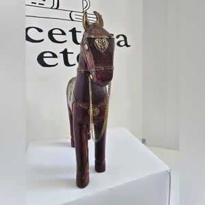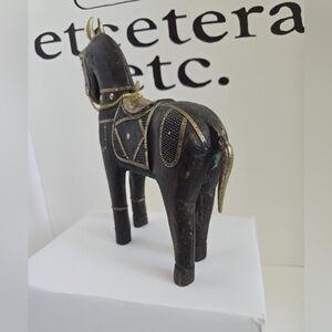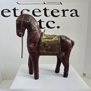 Hand Carved Wooden Horse Brass & Copper Accents Statue Figurines Set Of 2