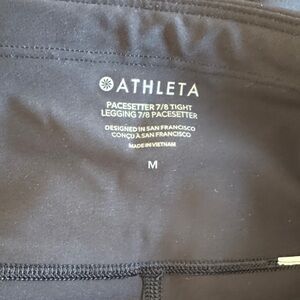 Athleta Pacesetter leggings in a 7/8 length. Fabric is really nice- a bit more slippery which makes it resist pilling. Ideal for running or any cardio. Has a zip pocket at the waistband and an infinity drawstring. Hem is slightly rounded (tulip cut).