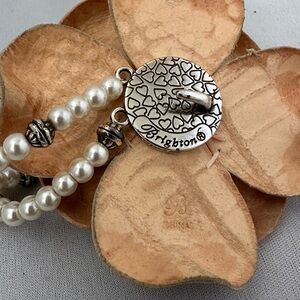 Signed Brighton belt with silver tone chain on one side and two strands of faux pearl beads on the other side. There are silver tones spacers in the pearls strands. The center is a tan colored leather flower with a large pearl bead in the center. Measures 37” long and the flower is about 4” wide. In very good condition.