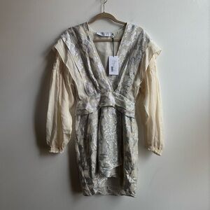 Shimmer into the spotlight with the IRO Olanda Dress. This stunning piece, crafted from a luxe blend of cotton, silk, and a touch of metallic allure, perfectly embodies the brand's signature fusion of vintage charm and modern flair. Featuring an elegantly ruched waist, layered shoulders, and smocked cuffs, its design highlights your silhouette while adding a playful edge. Fully lined and easy to slip into with a hidden side zip, this dress is the ultimate choice for day-to-night versatility