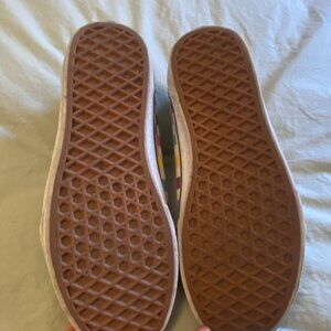 Fun rainbow checkered Vans. Used and show signs of wear, but still have a ton of life left in them. Comfy!
