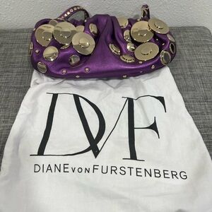 Diane von Furstenberg gorgeous purple clutch with attachable gold studded straps. Strong magnetic closure. 10inches in length. Clean inside and out.