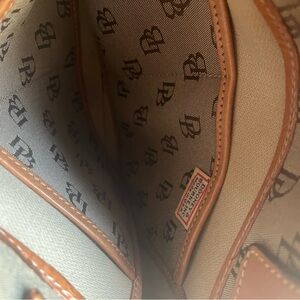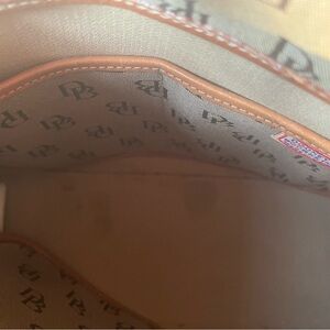 Chic Dooney & Bourke Bag with signature monogram. Stylish tan design with leather accents. Perfect for everyday use. Some sign of wear , clean inside and out .Good Condition.