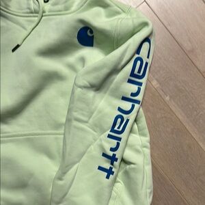 Only worn 1/2 times. Vibrant Carhartt hoodie in neon green. Features blue logo details. Ideal for everyday comfort.