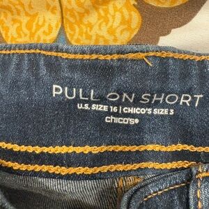 NWT Chico's pull on jean shorts in a classic dark blue. Features frayed hem and contrast stitching. Perfect for casual wear. Smoke free home. Size 16