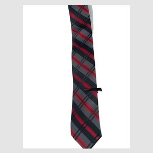 RED/BLACK/GRAY STRIPED JF J. FERRAR MEN’S NECK TIE & BLACK TIE CLIP