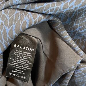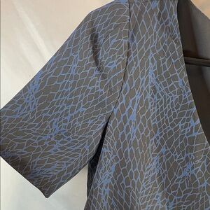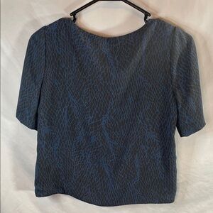 Chic navy blouse with a unique pattern. Features a flattering V-neck. Perfect for versatile styling. Item has been gently used/worn, no stains or tears, fully intact at seams.