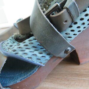 FREE PEOPLE Rendering Perforated Leather Buckle Heel Platform Clogs in Taupe Teal - Women's Size EU 38 / US 7.5