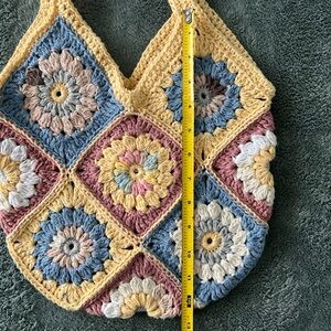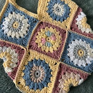 Designed with vibrant granny squares in pastel yellow, blue, pink, and cream, it’s perfect for adding a touch of boho charm to any outfit.