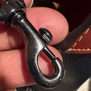 Sleek black leather with brown accents. Spacious interior. Perfect for everyday use. Zipper closure.