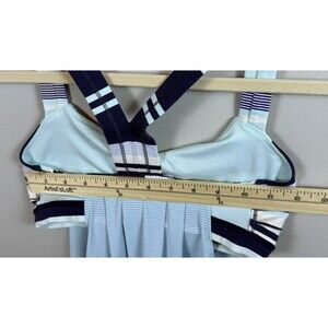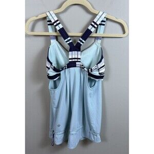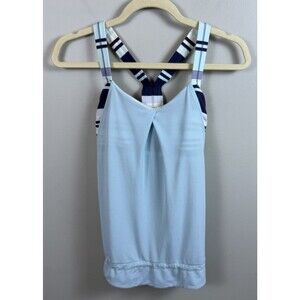 The Lululemon Rest Less Tank in Heathered Aquamarine and Groovy Stripe Cadet Blue is a stylish activewear top perfect for all seasons. This sleeveless tank features a scoop neckline, racerback strap type, and a pullover closure. Made with a light fabric wash, it offers a comfortable fit for athletic activities such as gym training, cross-training, crossfit, and yoga. With built-in bra support and a drawstring feature, this tank from the Lululemon Rest Less product line is a versatile and functional addition to any active woman's wardrobe.