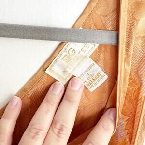 Vintage Satin Jacquard Embossed Floral Print Slip Dress Orangish Brown Deep V-Neck Size Large {L}. Color is kind of Bronze-like. Super pretty in person. Very good vintage condition. Vintage brand is BG Intimates. 100% Polyester. Machine wash. Tumble dry low. This is such a stunning piece. Deep V-neckline with fabric buttons. You can see skin through front down center of neckline. Midi length.