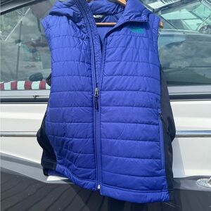 Vibrant cherry quilted vest. Features a sleeveless cut and front zipper. Ideal for layering.