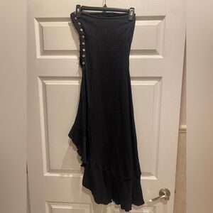 Strapless black dress, button up side, side slit with ruffle hem