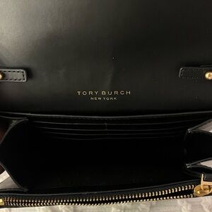 Chic and compact, this Tory Burch quilted leather mini crossbody bag is a timeless staple. Designed with soft black leather in a diamond quilted pattern, it features a gold-tone Tory Burch logo on the front flap and a gold chain strap with leather shoulder detail for comfort. Perfect for nights out or everyday minimalism. Is overall in great condition.