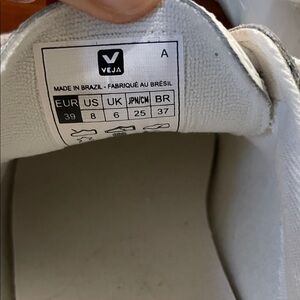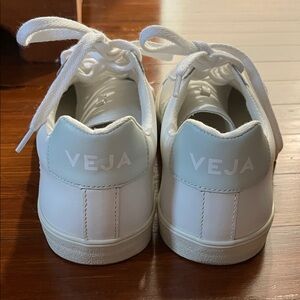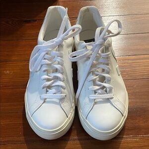 Chic leather sneakers with a minimalist design. Features signature Veja logo in light baby blue. Near perfect condition. No signs of wear.