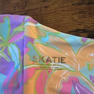 Tropical floral bikini top with vibrant colors. Features a strapless design. Removable ties for support.