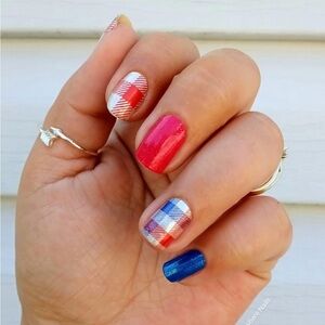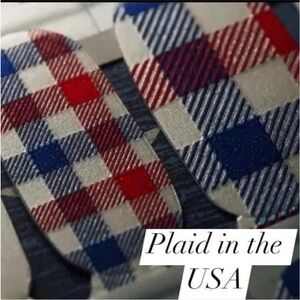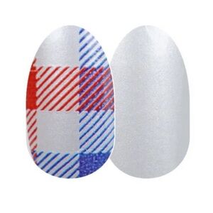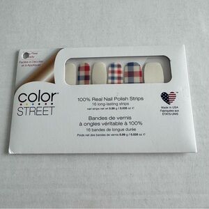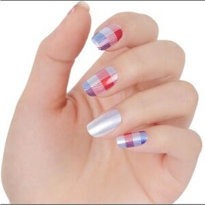 New in package Color Street nail strips. Retired “Plaid in the USA” is a shimmering porcelain white base featuring denim blue and ribbon red gingham check.