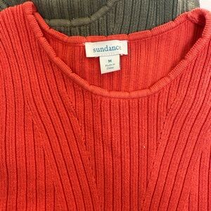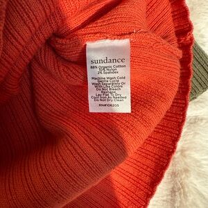 Bright orange, olive and black knit sweater by Sundance. Cozy and stylish.