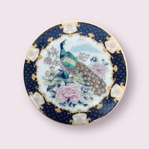 This Vintage Rayware Porcelain Imperial Peacock Trinket Box is a small, delicate piece made of china and porcelain, showcasing a beautiful floral peony design with a blue, white, and pink colour scheme with gold accents. Crafted in Japan, this trinket box features intricate peacock motifs on the lid, adding a touch of elegance and charm to any vanity or dressing table. Perfect for storing small treasures or jewellery, this piece is a unique and stylish addition to any collection.