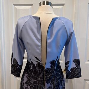 Chic boutique sheath dress with bold black floral accents. Ideal for stylish outings. Scuba like fabric. 3/4 sleeve and zips in the back. Size tag is missing. Fits about a size 6.