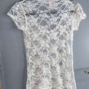 Elegant white lace top with short sleeves. Perfect for layering or wearing alone, depending on your style and taste. Very versatile piece. Lace has a slight shine to it, very adorable top that can be used from an edgy modern to vintage baby doll style.