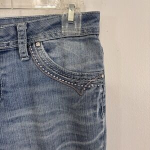 The product is a pair of Earl Jeans Women's RN#89302 STRAIGHT LEG Stretch Medium Wash jeans in size 6. These mid-rise jeans feature a straight fit and are made from a blend of spandex and cotton for stretch. The denim fabric has a medium wash with embroidered accents, and they have a 5-pocket design with a zip closure and belt loops. The jeans are designed for all seasons and have a solid blue color with a modern theme. Perfect for a comfortable and on-trend look.