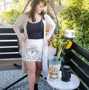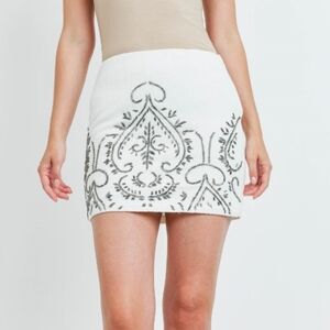 Beaded Mini Pencil Skirt. NWT boutique item. Size Small. Shell: 100% Cotton. Lining: 100% Polyester. Approximate measurements: 27 inch waist, 35 inches hips, 14.5 inches length. Overall the skirt does not have stretch. The waist does because it has elastic. The inner lining is also stretchy. Side zipper and clasp. Absolutely gorgeous in person. Comes with extra beads. Very subtle floral embroidery on the skirt. Pair with a cardigan, boho hat, and boots for fall.