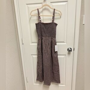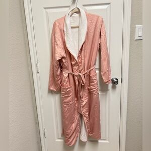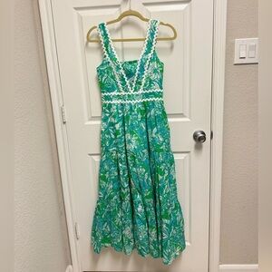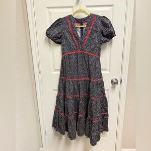 Size medium. Pink and white striped dress with pink and white hand embroidery around neckline and arms and middle front. Pink rubber inner lining at borders. Light armpit marks but untreated. Ruffle shoulders. GUC. LR4-85
