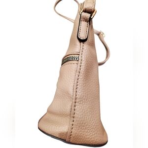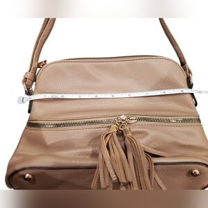 Stylish and versatile, this beige/tan crossbody bag features chic tassel accents. Ideal for any outing. Striped interior, front zippered pocket. Gold color zipper. Vegan Leather- easy to maintain and wipe down for cleaning