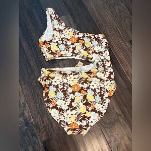 Elegant swimsuit with floral design. Features brown, yellow, and blue hues.