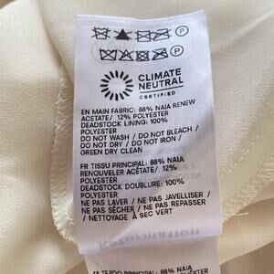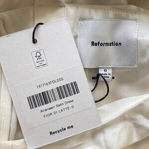 Reformation Arianwen Satin Dress in Fior Di Latte. Size 0. Features fitted bodice, full skirt, adjustable straps, v-neck, lined double satin fabric, front button detail, back zipper with hook and eye closure, long maxi floor length. 88% NAIA renew acetate, 12% polyester. Style 1317163FDL. Brand new, never worn, NWT / New with tags. Sold out style. Tags: bachelorette, ball, beach, black tie, bridal, bride, ceremony, cocktail, cream, destination, gala, gown, eggshell, elope, elopement, evening, event, formal, marriage, married, party, reception, rehearsal, shower, special occasion, wedding, white Chest: 14" Waist: 12" Length: 57" Measurements taken flat and approximate.