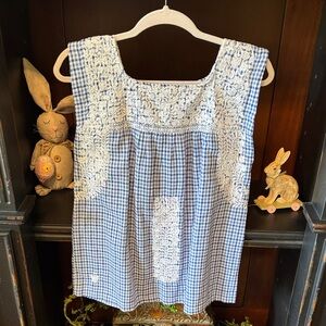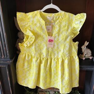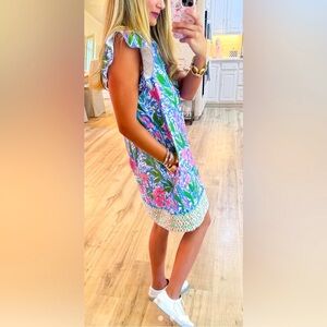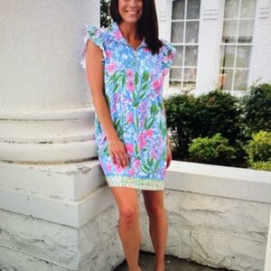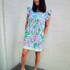 Charming floral dress with ruffled sleeves. Features vibrant pink flowers on a blue background. Perfect for a casual outing. Shoulder to hem is 34 inches. Has pockets and ruffles on sleeves. Kind of a lightweight scuba knit fabric. Armpit to armpit is 19 inches