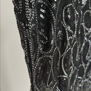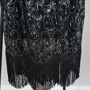 Elegant black midi dress with intricate silver patterns. Sleeveless design with fringe detail. Perfect for evening wear.