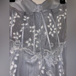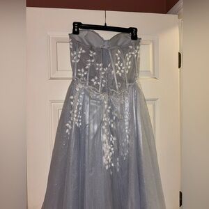 Stunning strapless gown in light blue with floral details and fully glittered corset and skirt! Perfect for a prom or formal, only worn once. Hemmed to 5’2-5’3