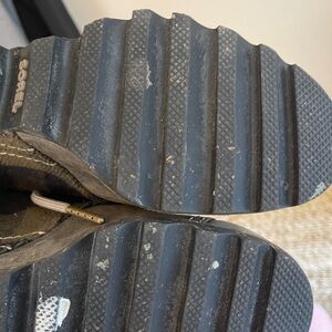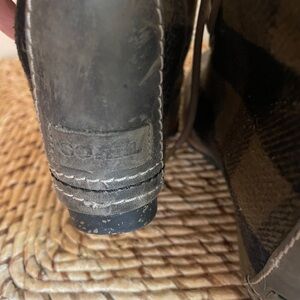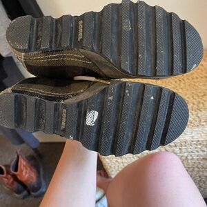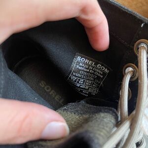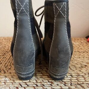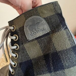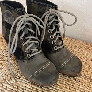 Chic Sorel ankle boots with plaid design. Features sturdy lace-up closure.