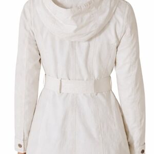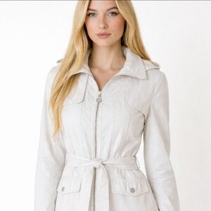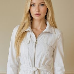 Features front full zipper closure and two pockets with silver-tone snap placket closure