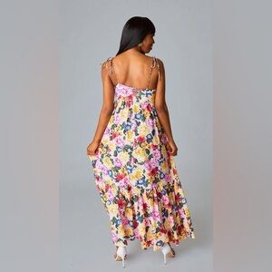 Brighten your wardrobe with this colorful maxi dress. Features a lively floral pattern. Ideal for any event.