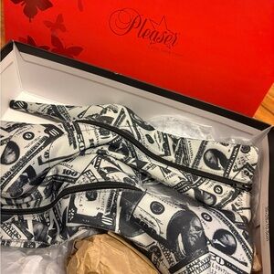 Striking platform boots with a bold money print. Features a high heel and sleek design. Perfect for making a statement.