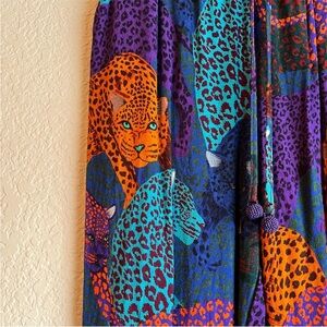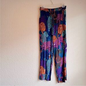 Vibrant leopard print pants with a drawstring waist. Features a mix of blue, orange, purple, and teal colors.