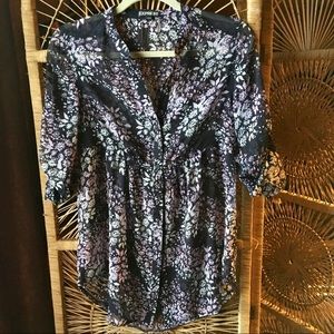 Beautiful sheer blouse with flower print. Navy with white and pink floral pattern. Buttons down the front. Sleeves can be worn rolled up or down. Cinched in the back. Higher on sides than middle.