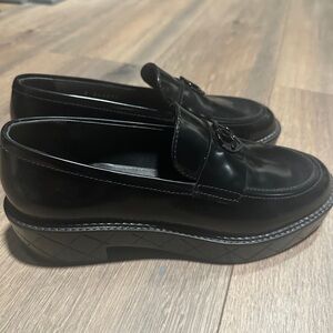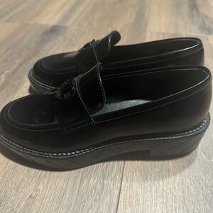 Sleek black loafers with a glossy finish. Features iconic Chanel emblem. Elevated platform design.