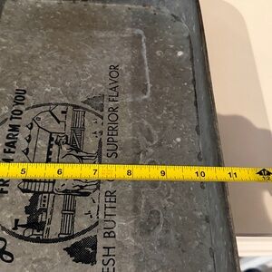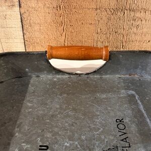 Charming rustic metal serving tray featuring wooden handles. Perfect for adding a vintage touch to your decor.