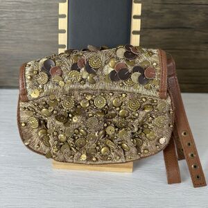 Anthropologie Lucky Penny Beaded Bag Gold Sequin Wristlet Clutch Coin Mini