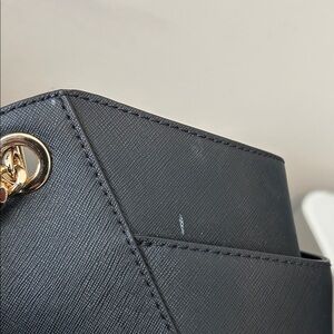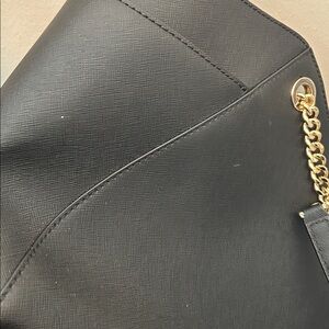 Chic black tote by Michael Kors. Features elegant gold chain details. Perfect for everyday style. Black satin inside.