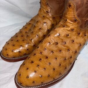 Justin men’s exotic roper boots with antique tan full quill ostrich foot and roper toe.
