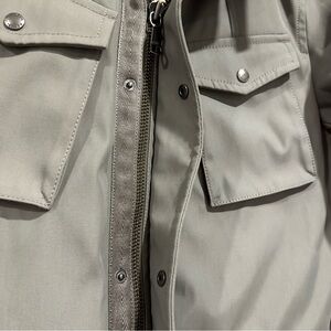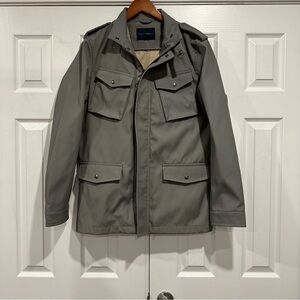 Banana Republic Grey/Green/Beige Unisex Jacket/Coat. Classic khaki military jacket with buttoned pockets. Zip & snap button closure. Interior pocket as well. Lined. No size or care tag. Approximate measurements: UA to UA 22” & Length is 30”. I can see either sex wearing this but was worn by a female. Durable and stylish design.in EUC!