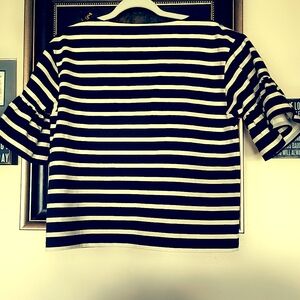 Chic and versatile J.Crew blouse featuring classic black and white stripes and stylish poofy half-arm length sleeves for a modern, feminine touch. Not fully cropped, but with a slightly shorter length that pairs perfectly with high-waisted jeans, skirts, or trousers. Excellent pre-owned condition with no flaws.